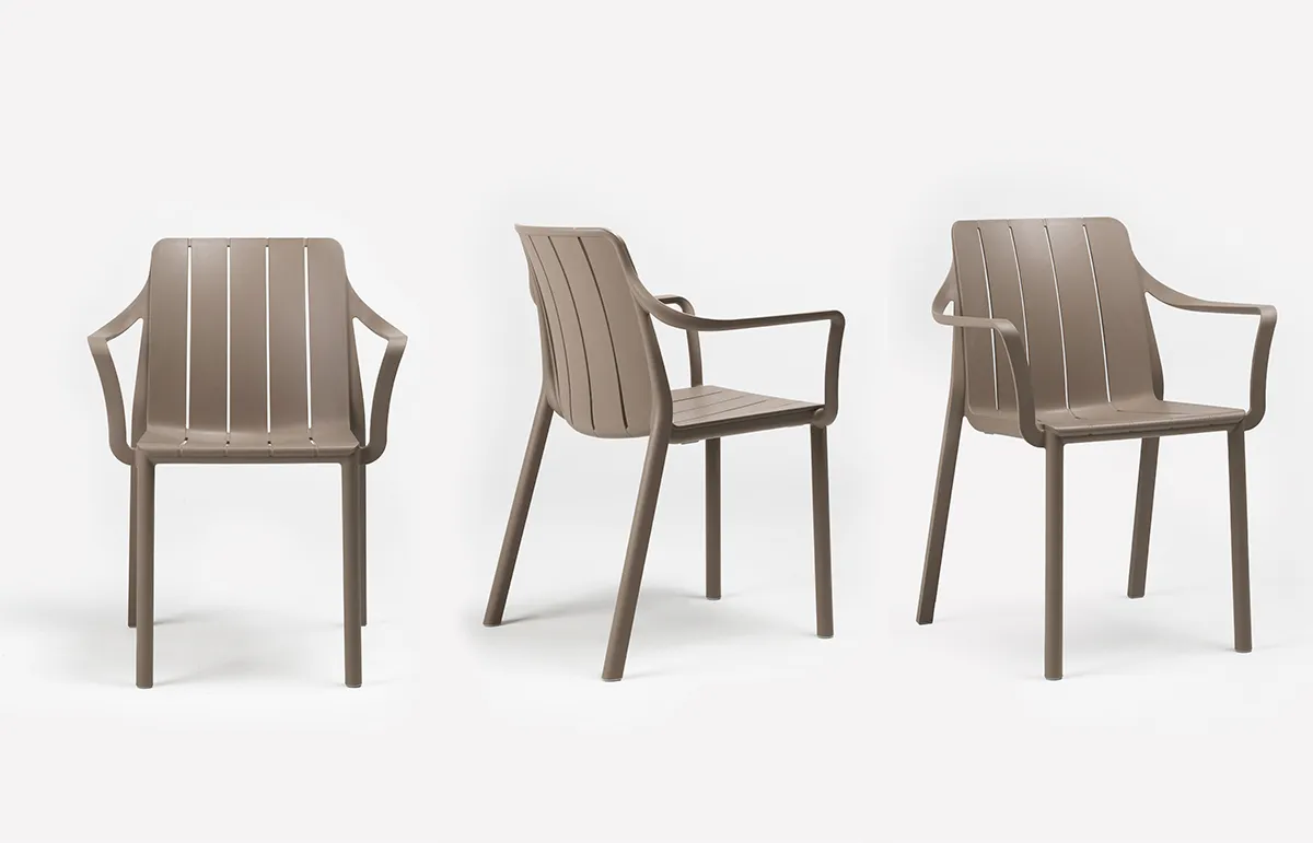 Materiale: Sedia monoblocco con braccioli in polipropilene fiberglass trattato anti- UV e colorato in massa. Finitura opaca. Dotata di piedini antiscivolo. Resina riciclabile.