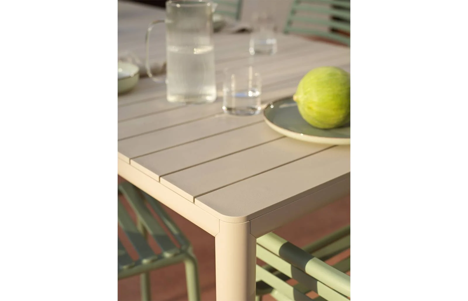 Materiale: piano in polipropilene fiberglass* trattato anti-UV e colorato in massa. Struttura in alluminio verniciato. Finitura opaca. Dotato di piedini regolabili.